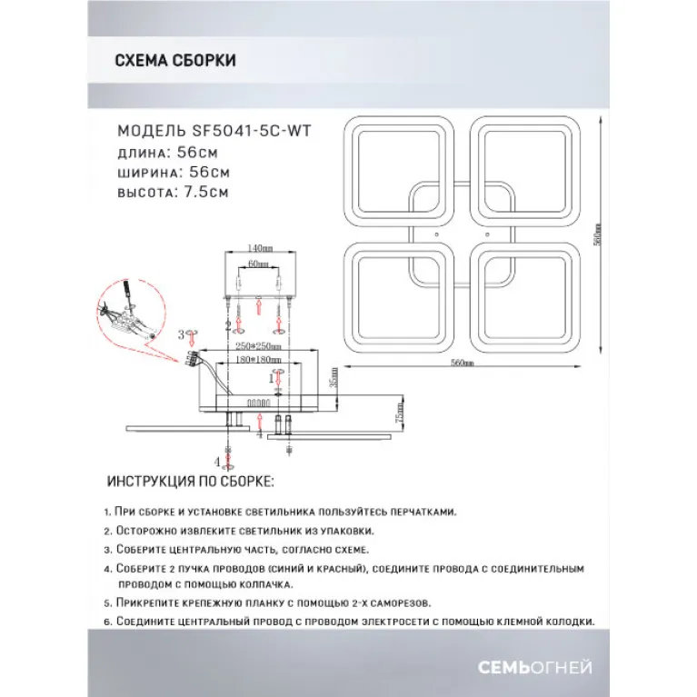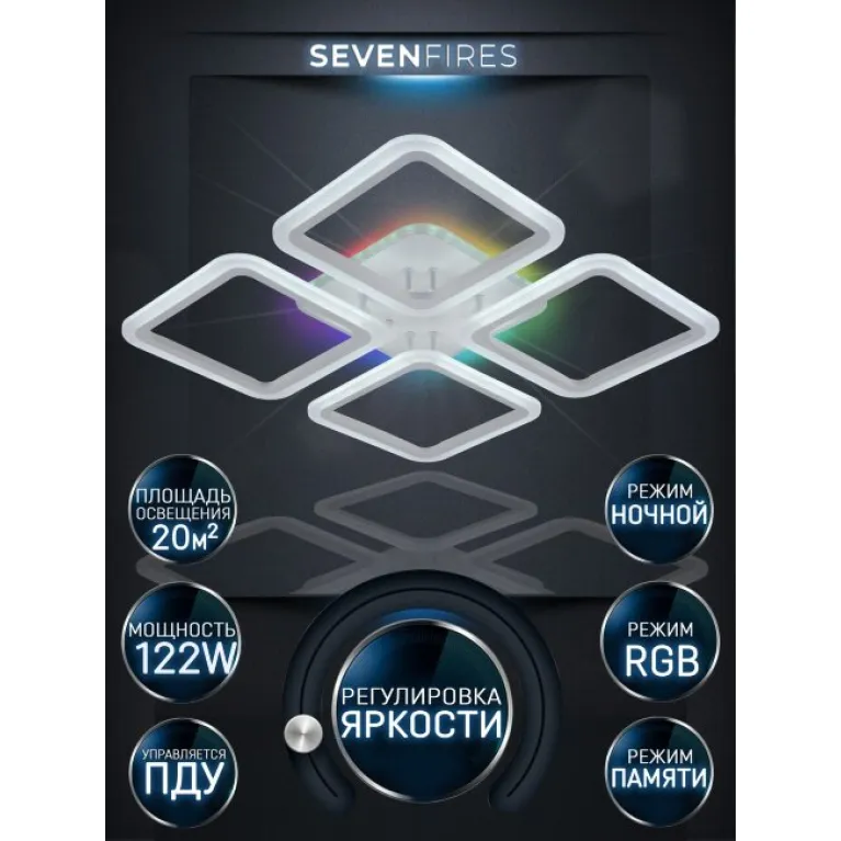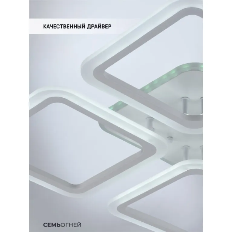 Преобладающий цвет плафонов: Белый, арматуры: Белый; материал изготовления арматуры: Металл, размеры, мм: длина 560 / ширина 560 / высота 75 Общая мощность – 112 Ватт, а максимальная площадь освещения до 20 м2. Основной тип ламп, предусмотренный производителем: Светодиодная с цоколем LED. В зависимости от предпочтений можно использовать лампы теплового, холодного или нейтрального света, за исключением люстр с типом цоколя LED.