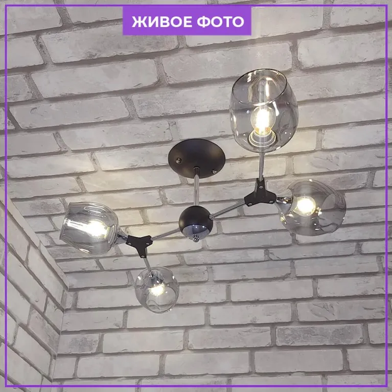 Люстра оснащена четырьмя лампами, что обеспечивает яркое и равномерное освещение пространства. Она прекрасно подходит для гостиной, столовой или спальни, создавая приятную атмосферу и подчеркивая стиль вашего дома. Основание выполнено из прочного металла черного цвета, а плафоны изготовлены из белого матового стекла, что придает светильнику современный и утонченный вид.