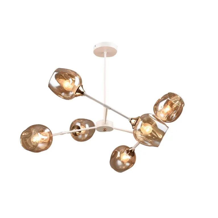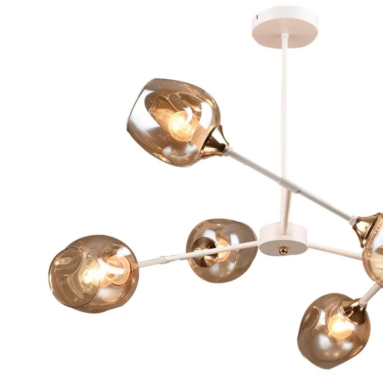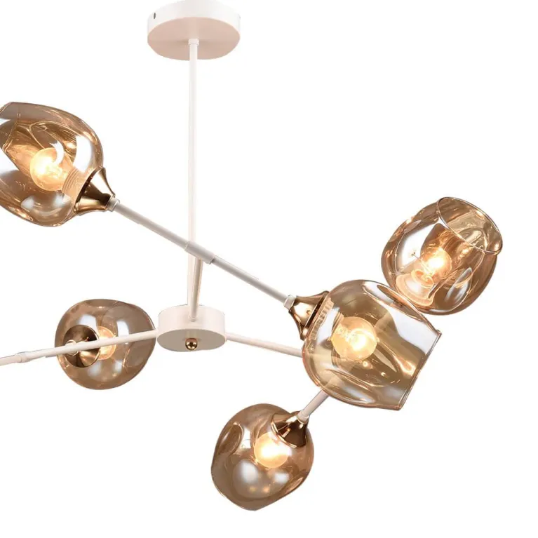 Изготовленная из прочного металла и качественного пластика, эта люстра отличается долговечностью и надежностью. Плафоны из белого матового стекла обеспечивают мягкое и равномерное рассеивание света, создавая комфортное освещение в помещении. Благодаря патронам E27 вы сможете использовать лампы мощностью до 60 Вт, что гарантирует достаточный уровень освещения.