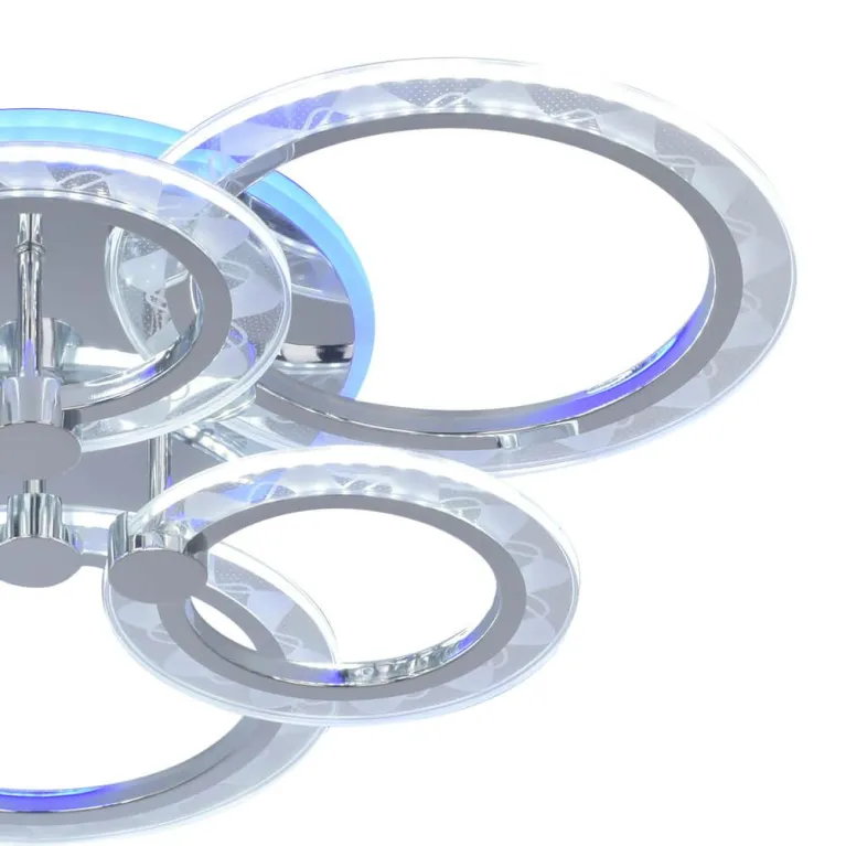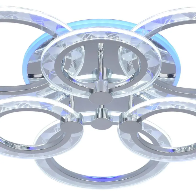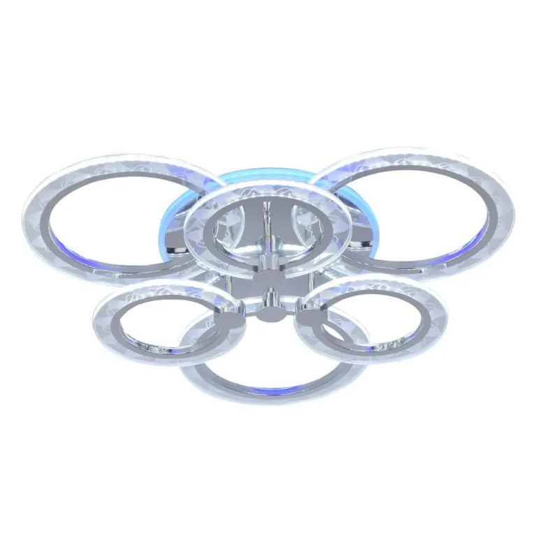 Люстра оснащена семью источниками света, что обеспечивает яркое и равномерное освещение пространства. Она выполнена в стильном хромированном корпусе с элементами RGB-подсветки, которая добавляет интерьеру современного и утонченного вида. Суммарная мощность ламп составляет 90 Вт, что эквивалентно яркому и достаточному освещению.