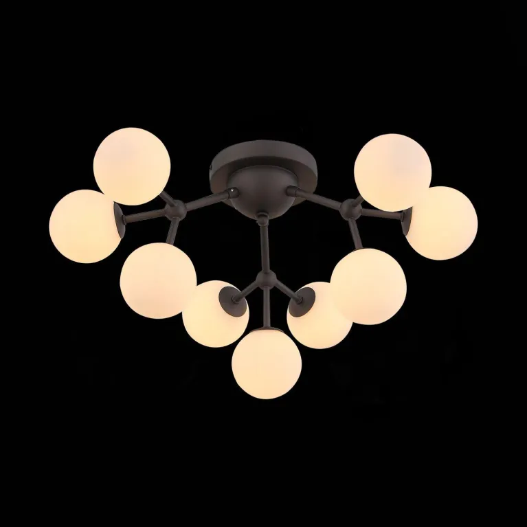 Корпус люстры выполнен из прочного металла с черным матовым покрытием, который прекрасно гармонирует с современным дизайном. Плафоны из белого матового стекла придают светильнику лёгкость и изящество, обеспечивая мягкое и равномерное рассеивание света.
