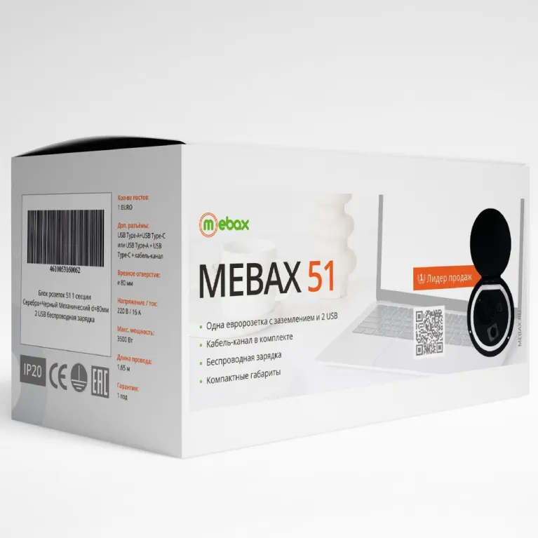 Блок розеток 51 (1 секция и 2 USB) Mebax 00-00000828 в Нижнем Новгороде китайского производителя Mebax будет долго служить владельцу, бесперебойно выполняя свои функции. Моделью просто пользоваться. При заказе в интернет-магазине «Иллюзия света» цена – 4 788 ₽.