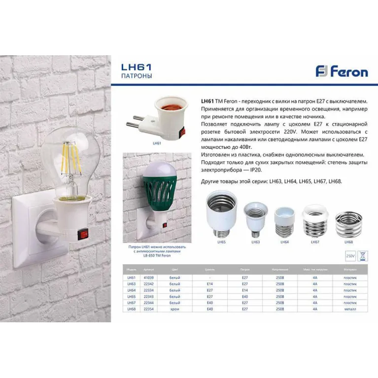 Патрон-переходник Feron LH61 41039 в Нижнем Новгороде российского производителя Feron будет долго служить владельцу, бесперебойно выполняя свои функции. Моделью просто пользоваться. При заказе в интернет-магазине «Иллюзия света» цена – 128 ₽.