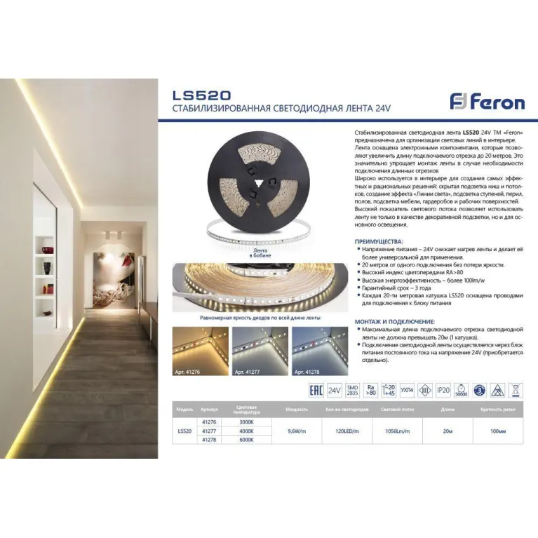 Светодиодная лента Feron 96W/m 120LED/m 2835SMD теплый белый 20m LS520-41276-136442 представляет собой идеальное решение для тех, кто ищет качественное и эффективное освещение. Эта лента длиной 20 метров оснащена современными светодиодами, которые обеспечивают яркое и равномерное освещение в диапазоне теплых белых оттенков.