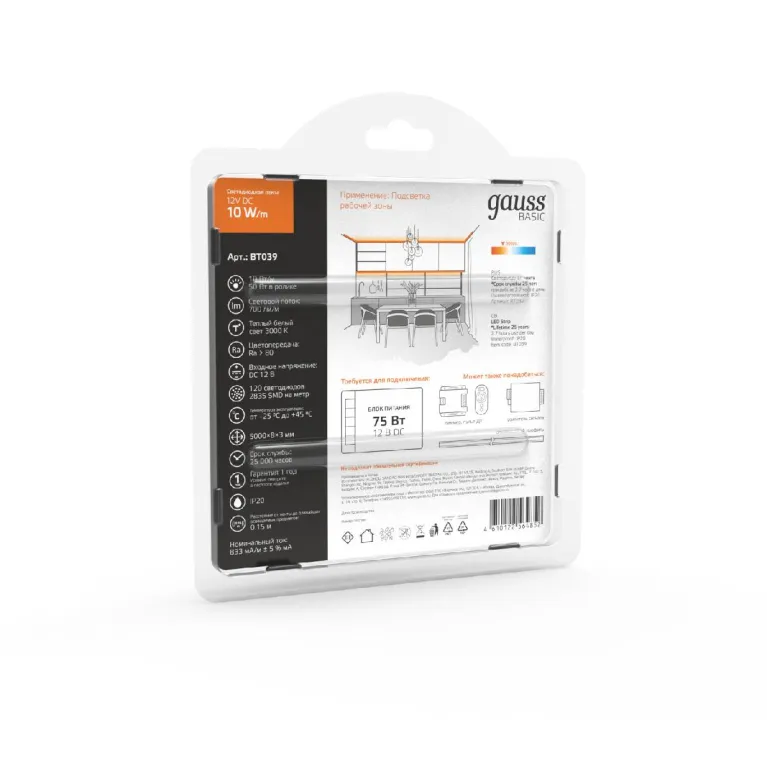 Светодиодная лента Gauss Basic 12В 2835 10Вт/м 3000K 5м IP20 BT039 в Нижнем Новгороде