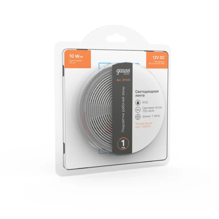 Светодиодная лента Gauss Basic 12В 5050 10Вт/м 3000K 1м IP20 BT033 в Нижнем Новгороде