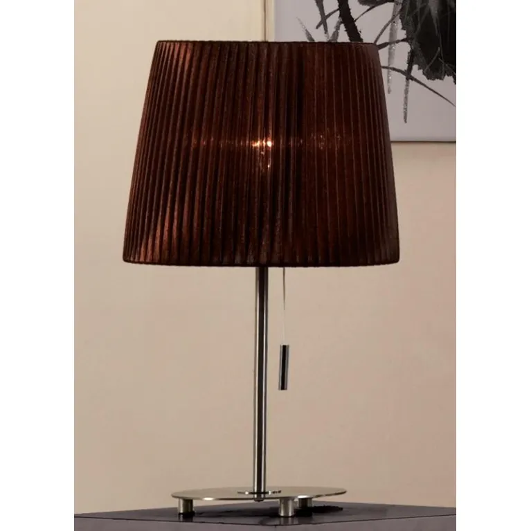Корпус лампы выполнен из прочного металла с шоколадным оттенком, который прекрасно гармонирует с различными стилями интерьера. Текстильный абажур белого цвета придает светильнику лёгкость и изящество, обеспечивая мягкое и равномерное рассеивание света.