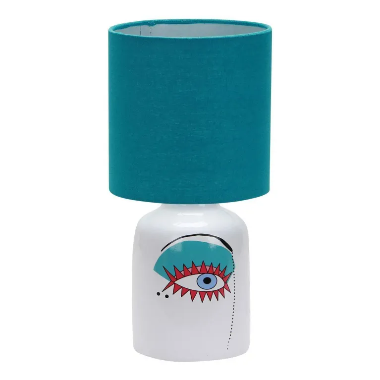 Корпус лампы выполнен из прочного металла с черным матовым покрытием и голубым акриловым элементом, придающим изделию современный вид. Текстильный абажур белого цвета обеспечивает мягкое и равномерное рассеивание света, создавая комфортное освещение рабочей зоны.