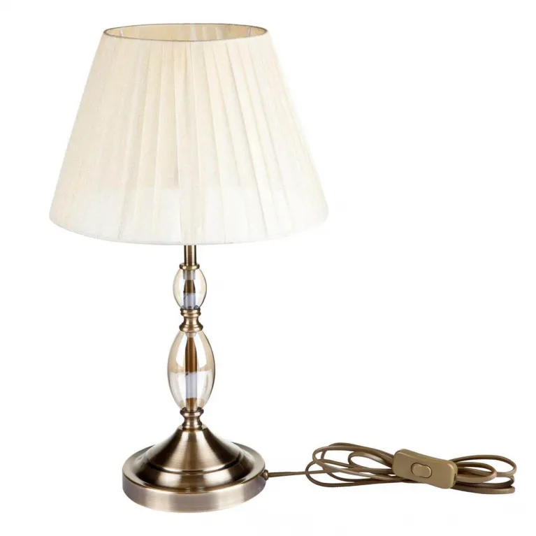 Корпус лампы выполнен из прочного металла с черным матовым покрытием и золотистыми вставками, который прекрасно гармонирует с различными стилями интерьера. Текстильный абажур белого цвета придает светильнику лёгкость и изящество, обеспечивая мягкое и равномерное рассеивание света.