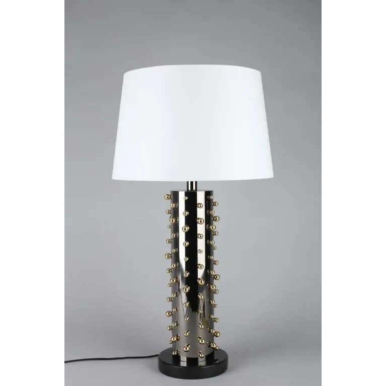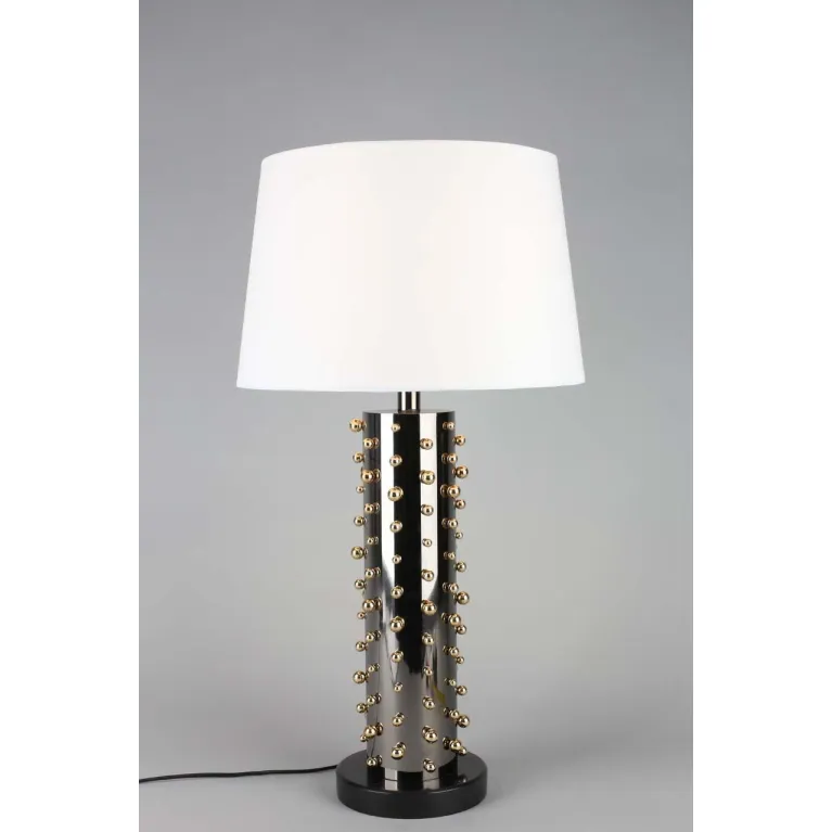 Корпус лампы выполнен из прочного металла с черным матовым покрытием, который прекрасно гармонирует с различными стилями интерьера. Текстильный абажур белого цвета придает светильнику лёгкость и изящество, обеспечивая мягкое и равномерное рассеивание света.
