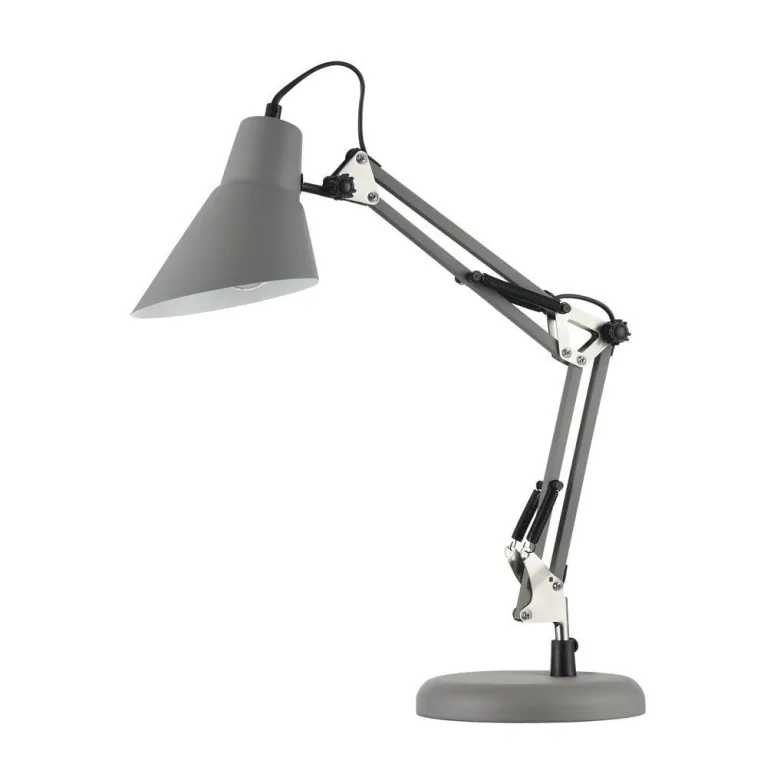 Корпус лампы выполнен из прочного металла с черным матовым покрытием, который прекрасно гармонирует с различными стилями интерьера. Текстильный абажур серого цвета придает светильнику лёгкость и изящество, обеспечивая мягкое и равномерное рассеивание света.