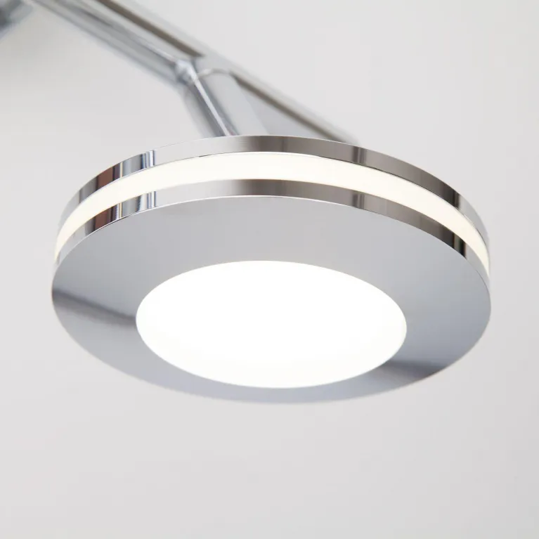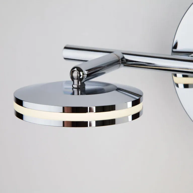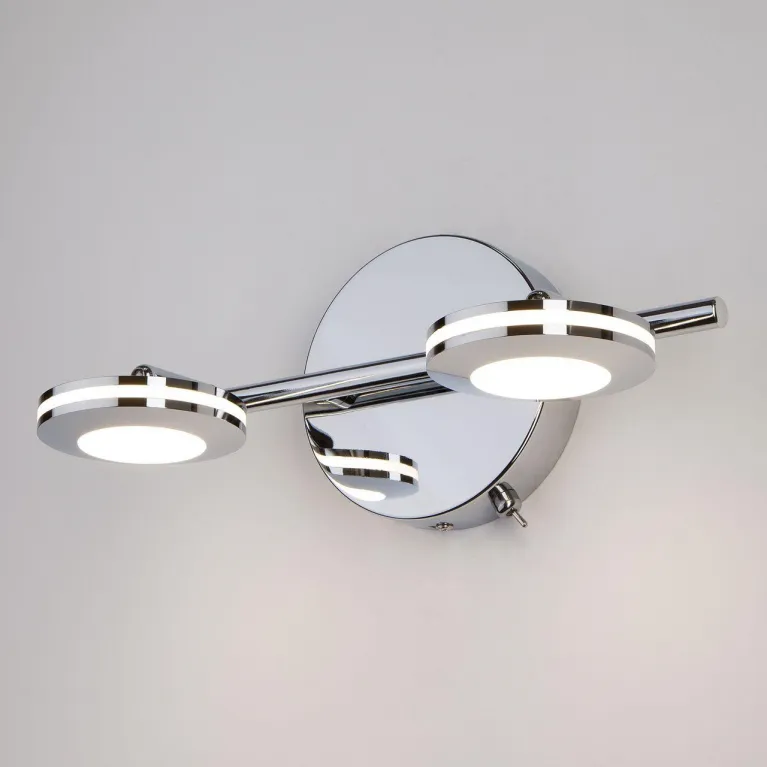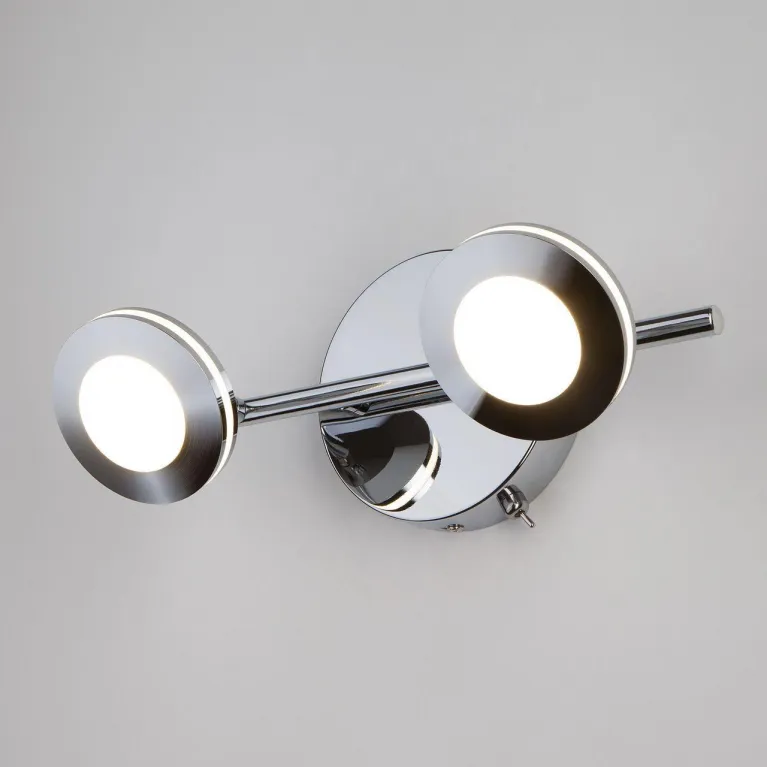 Корпус светильника изготовлен из высококачественного металла с хромированным покрытием, которое придает изделию современный и стильный вид. Спот оснащен двумя источниками света, что обеспечивает яркое и равномерное освещение пространства, создавая комфортную обстановку в вашем доме.