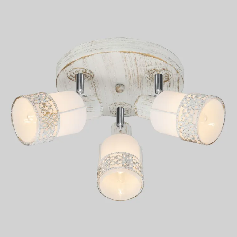 Корпус светильника изготовлен из прочного металла и имеет белое покрытие с золотистыми акцентами, что придаёт изделию изысканный и современный вид. Спот оснащен тремя источниками света, что обеспечивает яркое и равномерное освещение, создавая комфортную атмосферу в помещении.