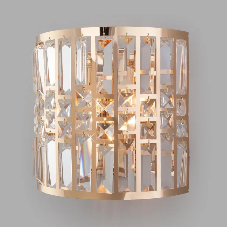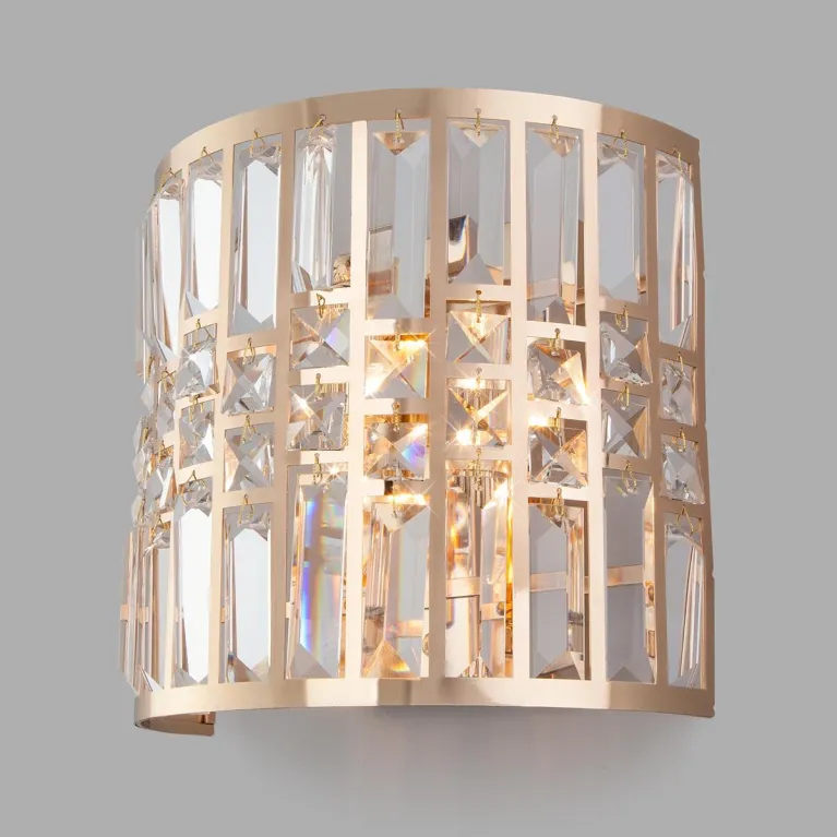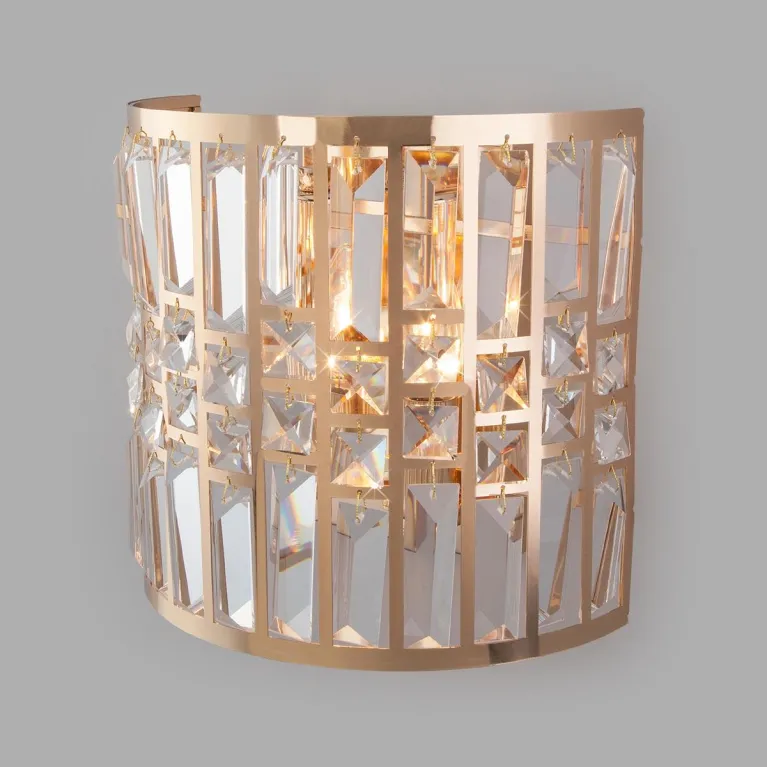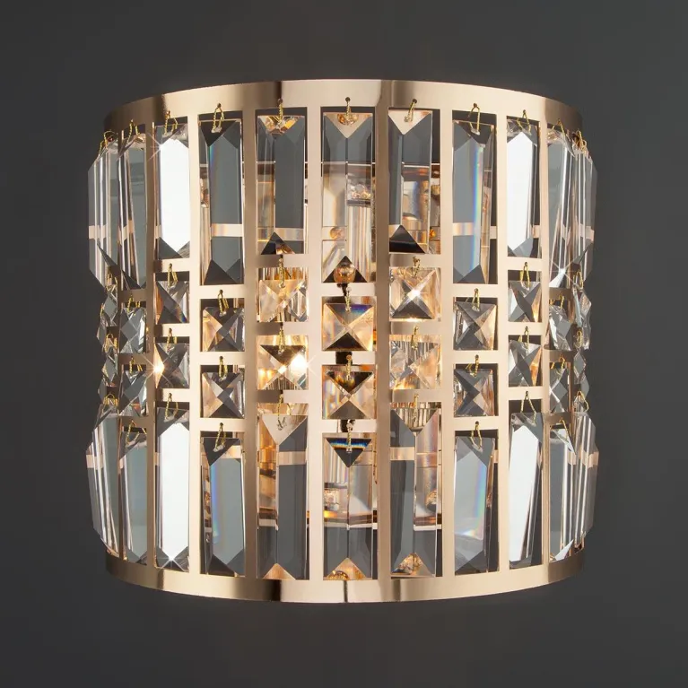 Корпус светильника выполнен из прочного металла с золотым покрытием, которое придаёт изделию роскошный и стильный вид. Прозрачные хрустальные подвески добавляют света изящества и мерцающего блеска, создавая утонченный и запоминающийся образ.