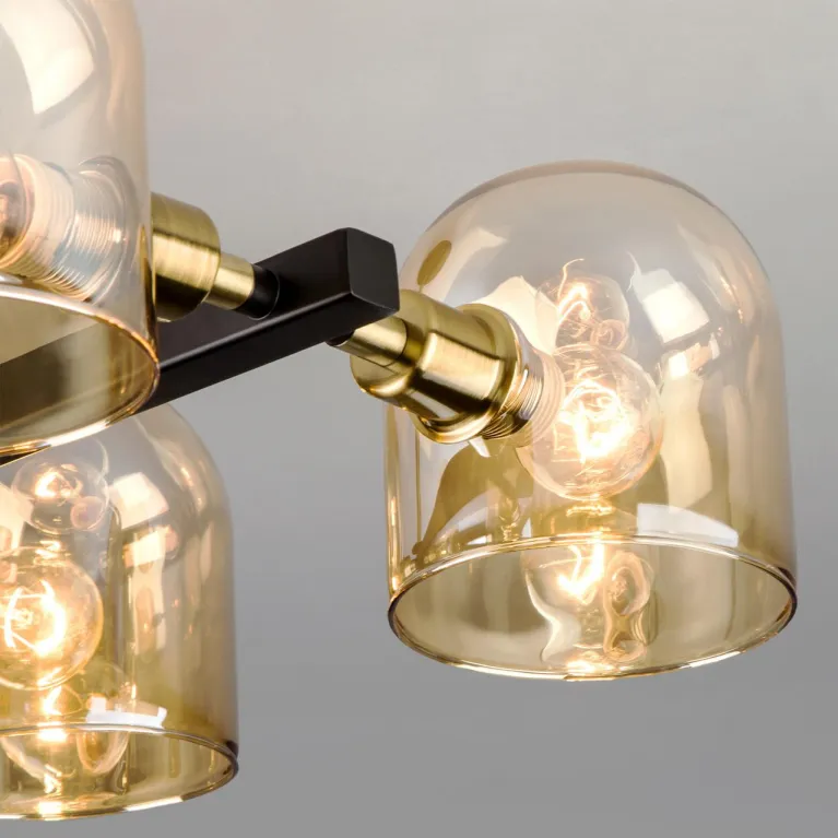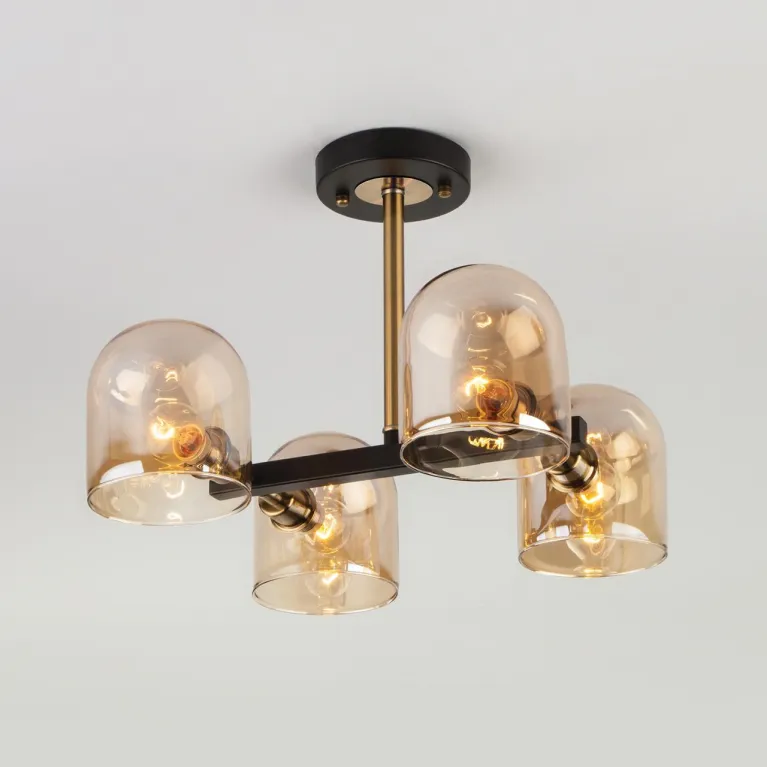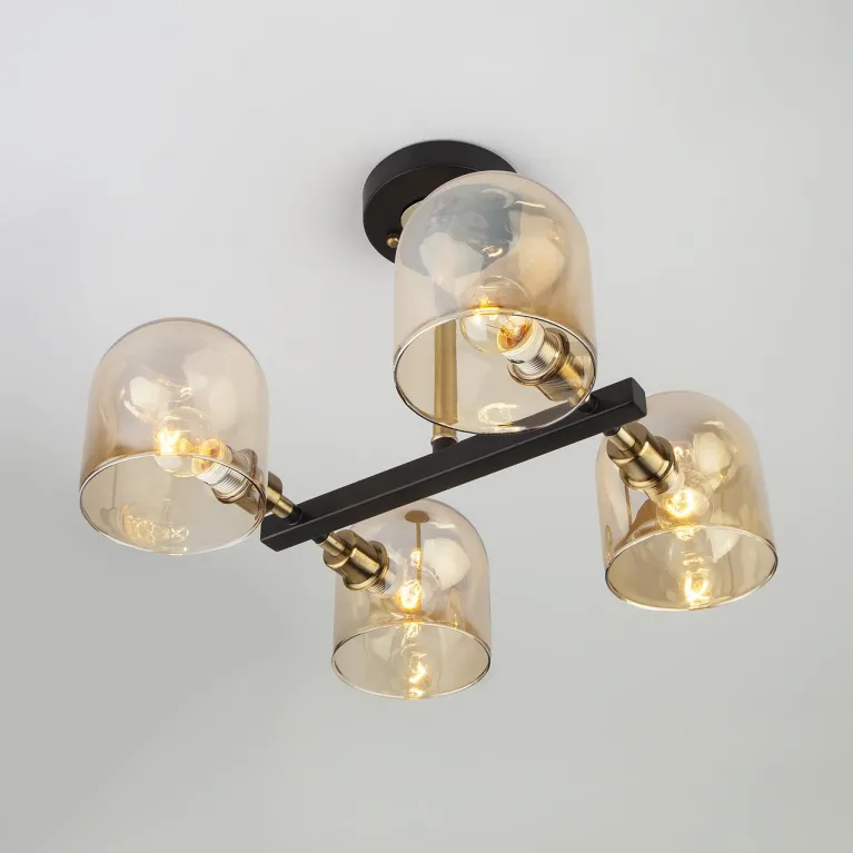 Люстра оснащена четырьмя лампами, что обеспечивает яркое и равномерное освещение пространства. Она изготовлена из прочного металла с черным покрытием, которое придает ей современный и стильный вид. Основание люстры имеет декоративную отделку под бронзу, добавляющую изысканности и утонченности.