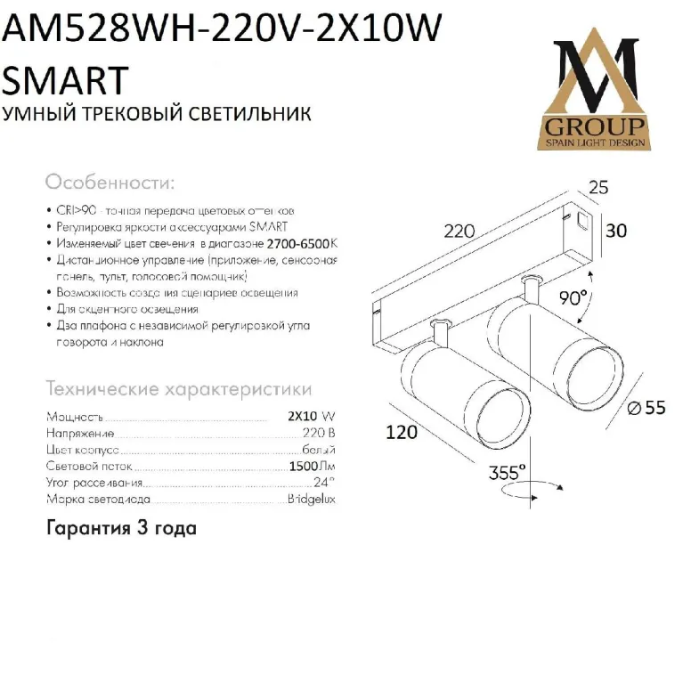 Трековый однофазный светильник AM Group AM528 WH-220V-2X10W SMART в Нижнем Новгороде из серии испанского производителя AM Group. В данном светильнике используются лампы с цоколем LED, суммарной мощностью 20 Вт. Модель оформлена в современном стиле и устанавливается на потолок. Она отлично подходит для гостиной.