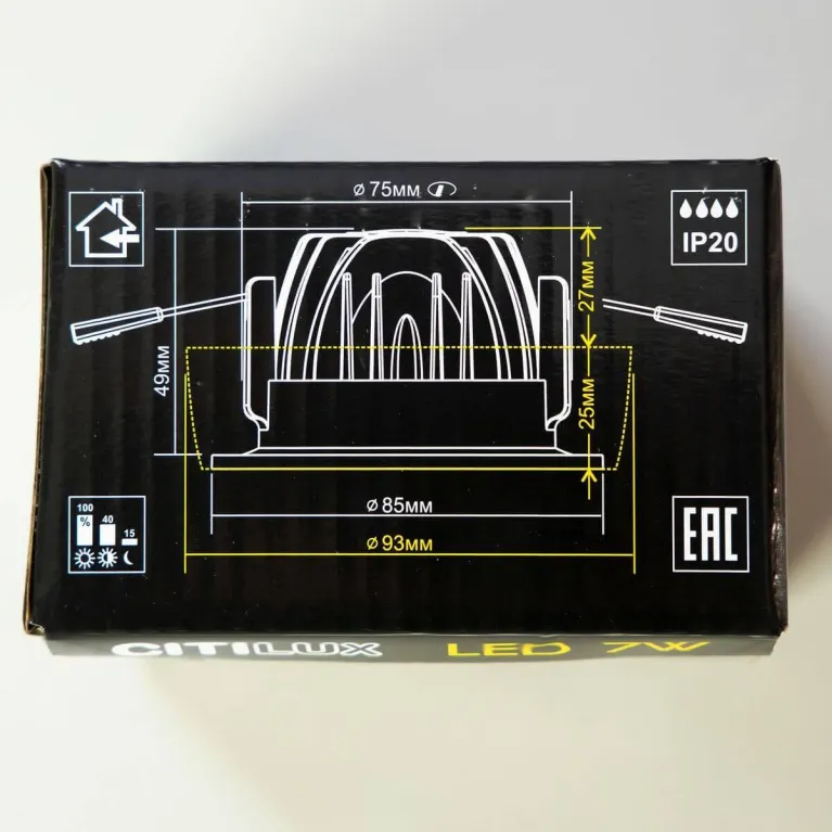 Корпус светильника выполнен из качественного пластика в стильном черном цвете, что позволяет ему гармонично вписаться в любой интерьер. Диаметр светильника составляет 90 мм, а высота — 40 мм, что делает его компактным и удобным для установки в натяжные потолки и другие поверхности.