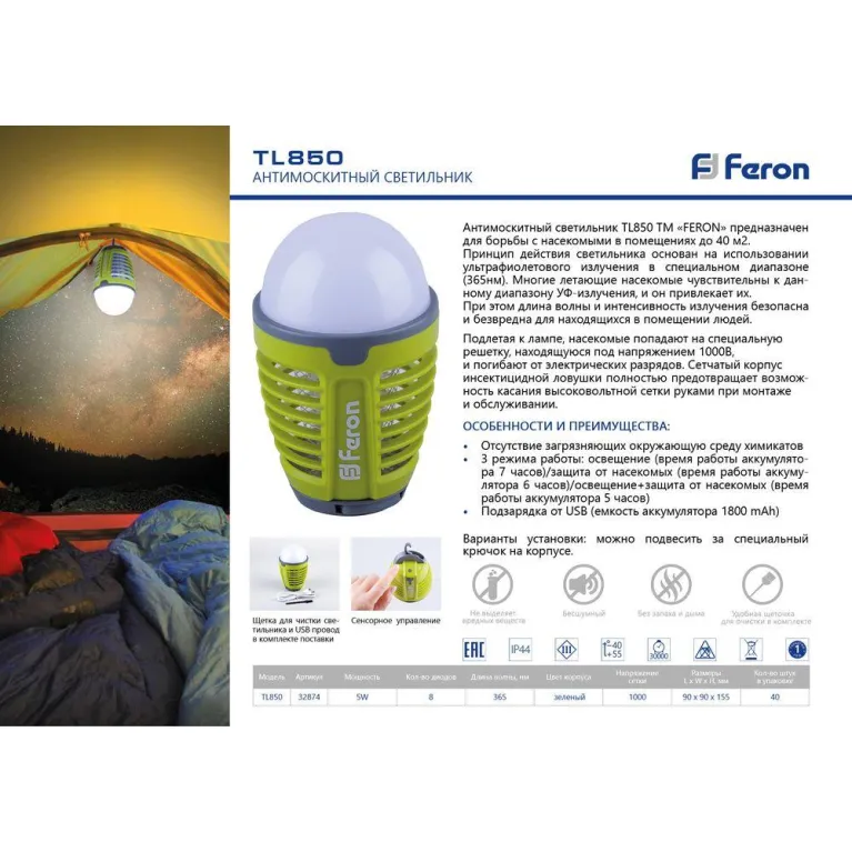 Кемпинговый антимоскитный светодиодный фонарь Feron TL850 аккумуляторный 155x90 мм 32874-96215 — это идеальное решение для тех, кто ценит комфорт и безопасность во время активного отдыха на природе. Этот фонарь сочетает в себе функциональность, долговечность и стильный дизайн, делая его незаменимым элементом вашего походного снаряжения.
