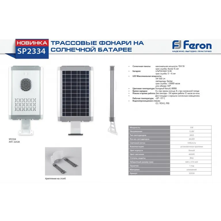 Консольный уличный светильник Feron SP2334-32028/111791, оснащённый солнечной батареей, станет неотъемлемой частью вашего сада, террасы или парковой зоны, добавляя им современный и стильный вид. Этот светильник сочетает в себе высокую функциональность и долговечность, что делает его идеальным выбором для наружного освещения.