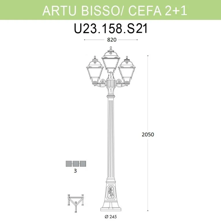 Уличный фонарь Fumagalli Artu Bisso/Cefa 2+1 U23.158.S21.BYF1R в Нижнем Новгороде итальянского производителя Fumagalli относится к коллекции «Artu Bisso/Cefa 2+1». Модель защищена от пыли и влаги по стандарту IP55 и подходит для использования за пределами помещения. Она легко устанавливается на пол и обеспечивает оптимальное освещение благодаря общей мощности 180 Вт. Эффектный и практичный светильник U23.158.S21.BYF1R с полимерными плафонами белого цвета будет долго служить владельцу. Цена при заказе в интернет-магазине «Иллюзия света» – 39 201 ₽.
