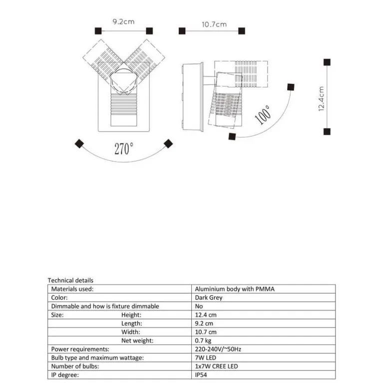 Корпус светильника выполнен из высококачественного алюминия с защитным покрытием, что гарантирует его долговечность и стойкость к атмосферным воздействиям. Благодаря степени защиты IP44 светильник надёжно защищён от пыли и влаги, что делает его идеальным для использования на открытых верандах, террасах или фасадах зданий.